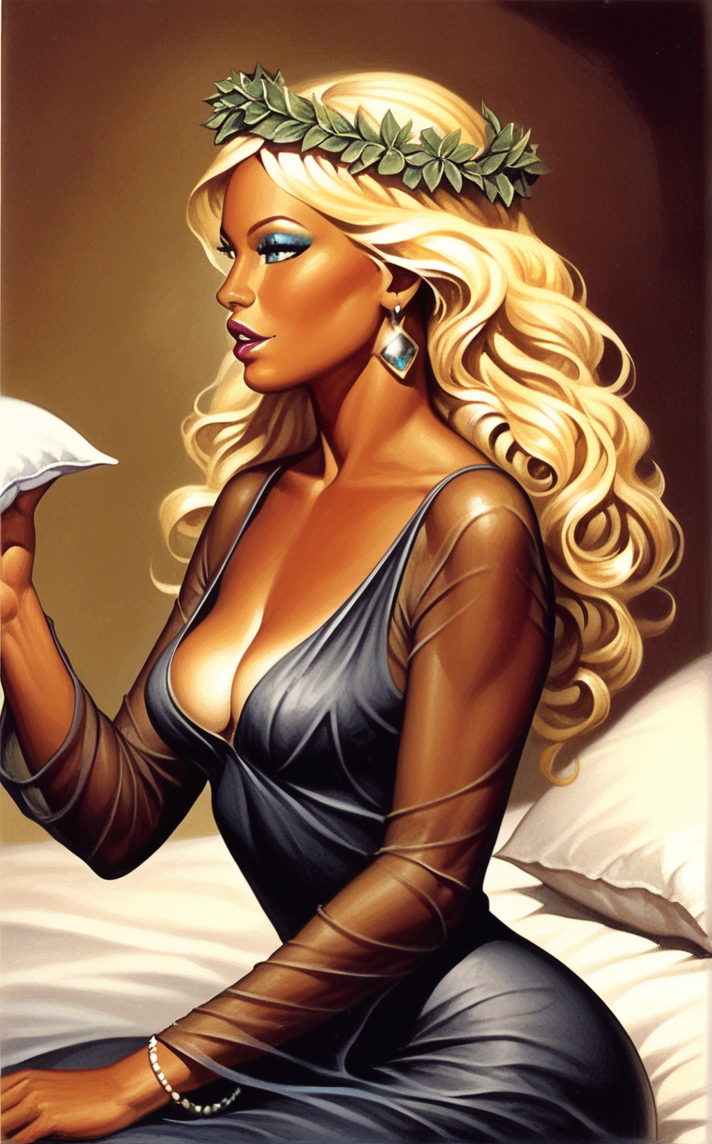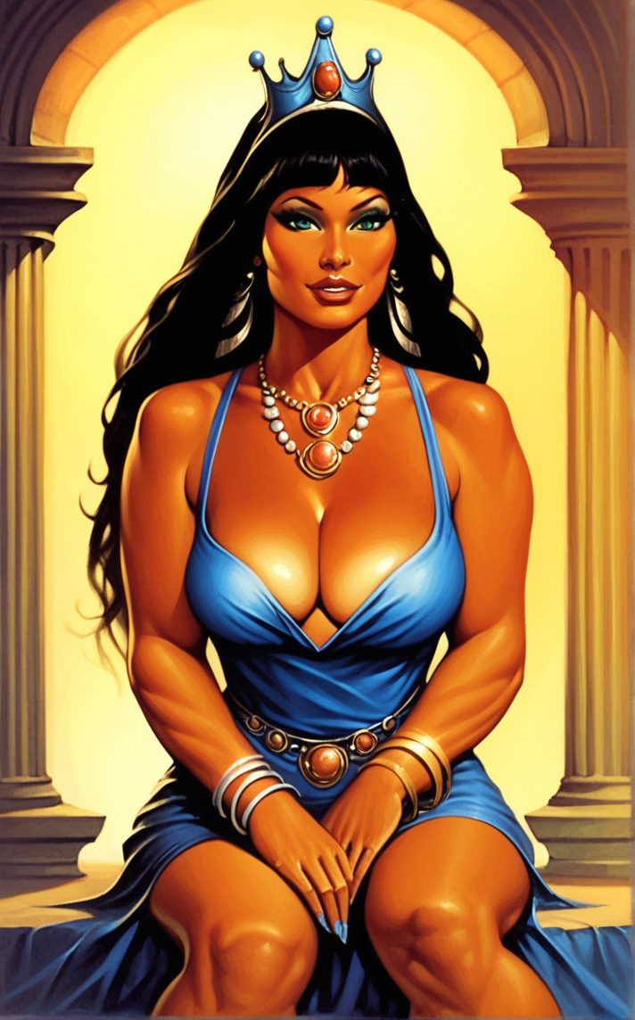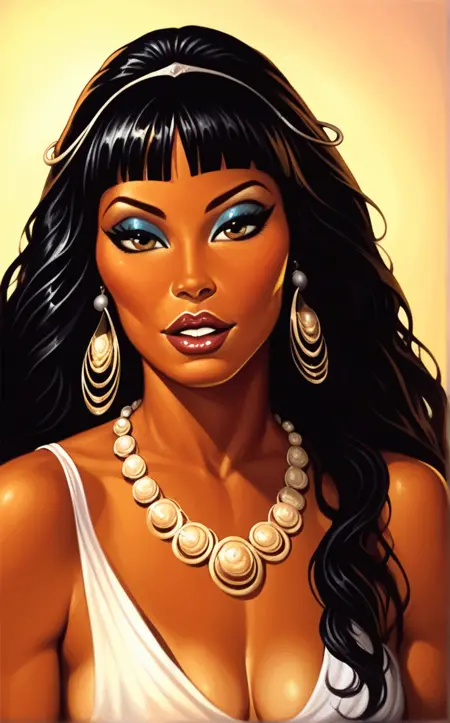 PONYXL_STYLE_kenkellyfantasyart_ownwaifu, 1girl, large breasts, black hair, navel, cleavage, jewelry, earrings, dark skin, necklace, dark-skinned female, crown, armlet, tiara, long hair, swimsuit, bikini, bracelet, strapless, makeup