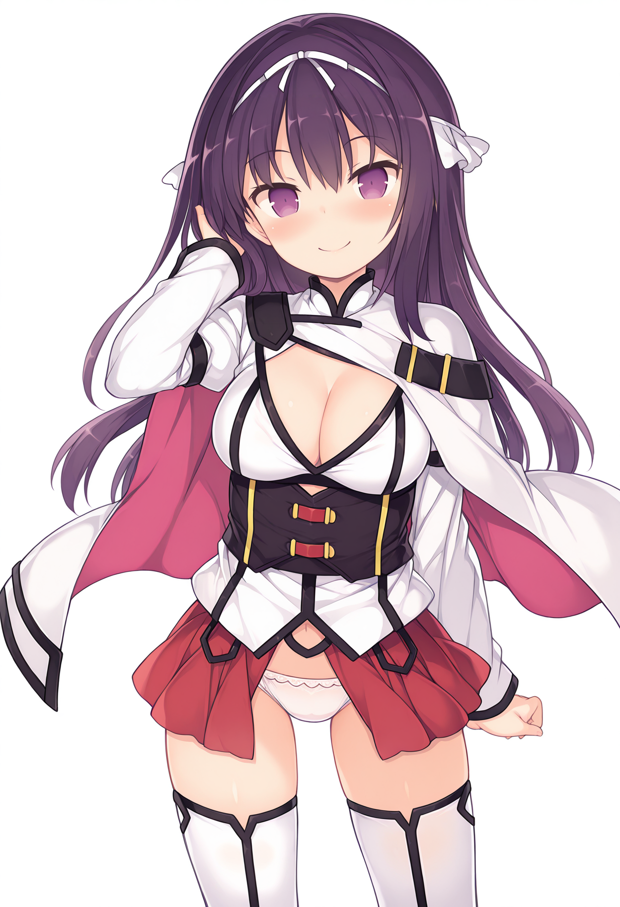 흰색 자켓, 흰색 망토, 양면 원단, 열린 자켓, 리본, 가슴 노출, 세로 스트라이프, 흰색 셔츠, 검은 테두리, 빨간 치마, 쇼걸 치마, 흰색 허벅지 양말, 흰색 팬티, 띠, 어깨 벨트