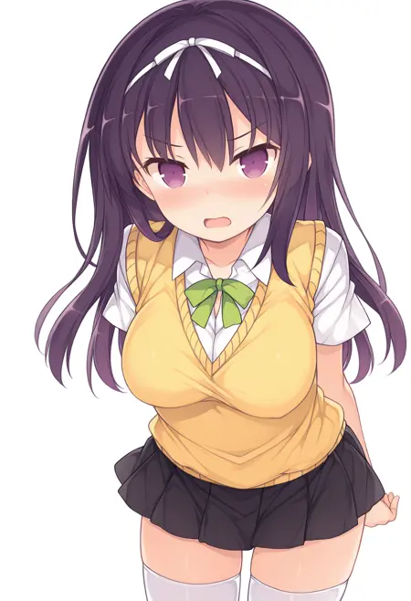 - 학교 복장, 노랑색 조끼, 흰색 셔츠, 짧은 소매, 스웨터 조끼, 검은 치마, 검은 허벅지 양말