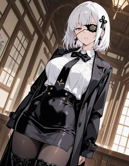 mai_pgr_vanessa,mature_female,(aged_up:2),short_hair,blunt_bangs,white_hair,purple_eyes,eyepatch,medium_breasts,earrings,hair_ornament,jewelry,white_shirt,long_sleeves,collared_shirt,black_necktie,black_bowtie,high-waist_skirt,pencil_skirt,black_skirt,black_bow,black_ribbon,black_pantyhose,thigh_boots,black_coat,covered_left_eye