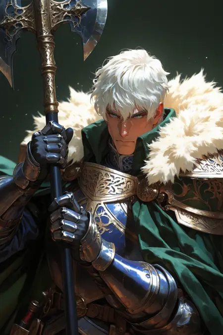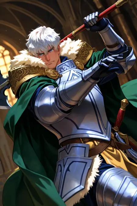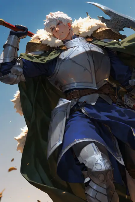 fur-trimmed cloak, green cloak, ornamental pauldrons, armor, gauntlets, blue surcoat, belt, armored boots,