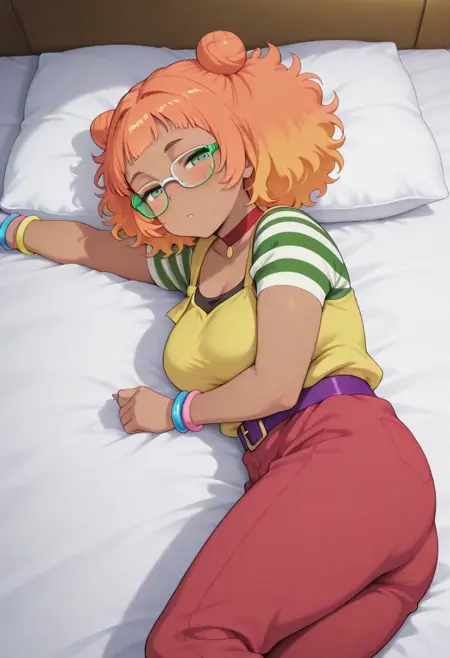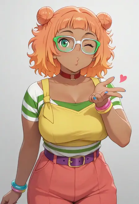 ふくよかで、短くカールしたオレンジとイエローのグラデーションの乱れた髪、スペースバニーズスタイル、濃い肌色、大型の四角枠の緑色レンズのメガネ、短袖の白と黒の縞模様のインナー、明るい黄色のトップス、濃い赤のチョーカー、青い爪、右腕にカラフルなブレスレット、裾を巻き上げたほんのりピンク色のルーズなパンツ、紫のベルトに四角いバックル、白い靴下、緑色のストラップ付きオープントゥサンダル