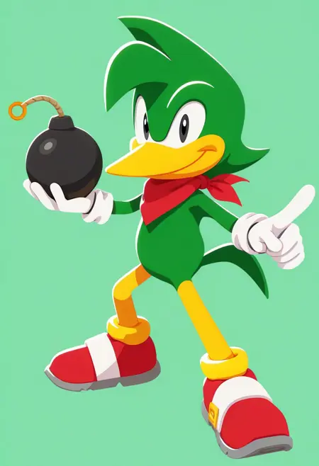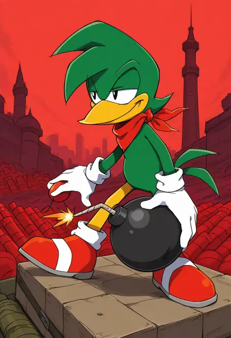 Bean the Duck, green skin, black eyes, yellow beak, green tail feathers, yellow legs, red scarf, red shoes, white gloves, holding bomb