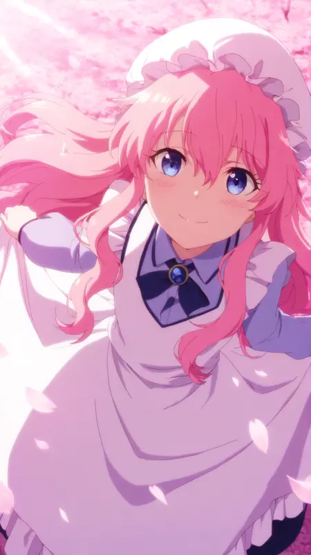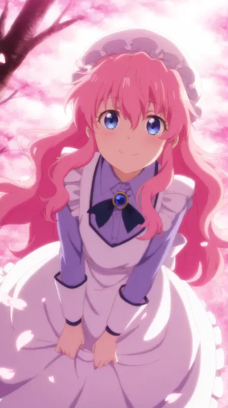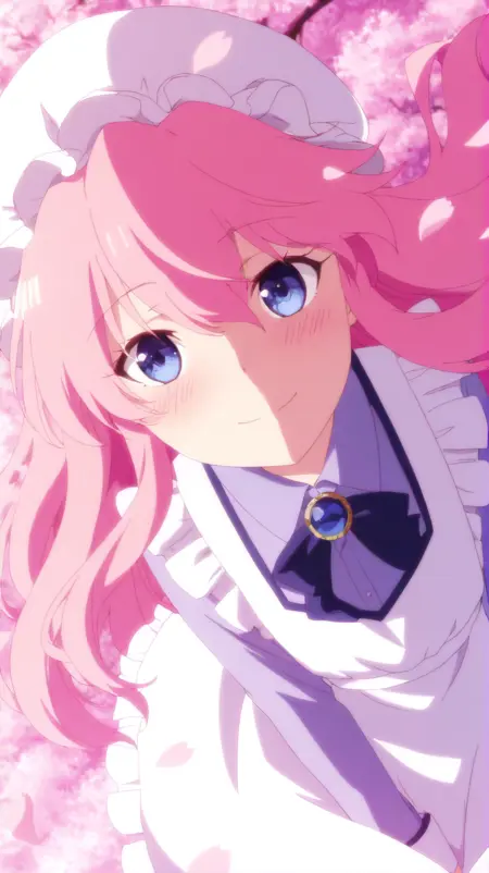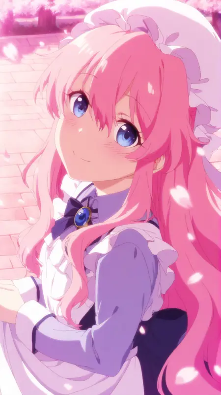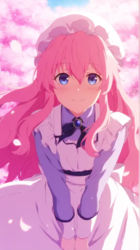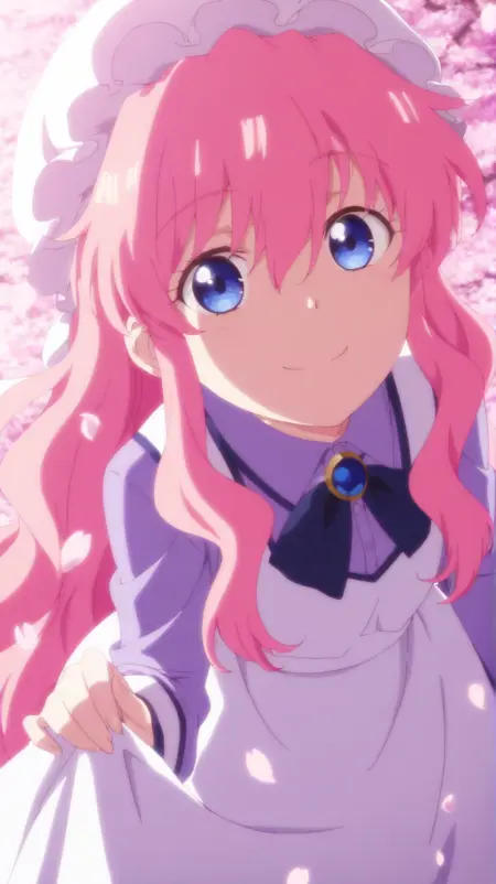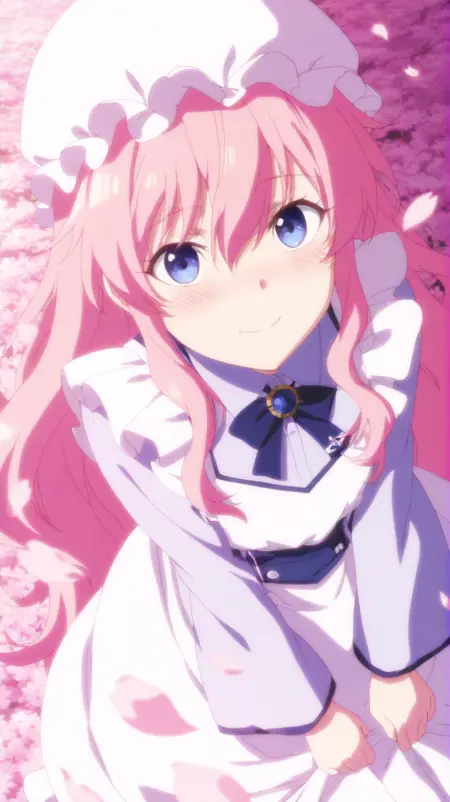 lora:fenmao:0.9,fenmao,1girl,pink hair,blue eyes,solo,hat,looking at viewer,long hair,mob cap,anime coloring,brooch,white headwear,hair between eyes,