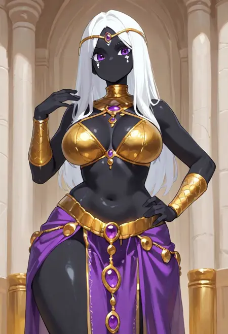 | 학습된 단어 | 1girl, colored skin, black skin, circlet, facial mark, white hair, long hair, white hair, circlet, purple pelvis curtain, gold belt, neck ring, bracer, large breasts, purple eyes, no mouth, hand on hip, hand up, thick thighs, <lora:queentyranime-40:1>, queentyr, golden bra복사됨! |