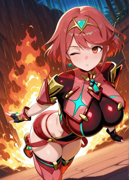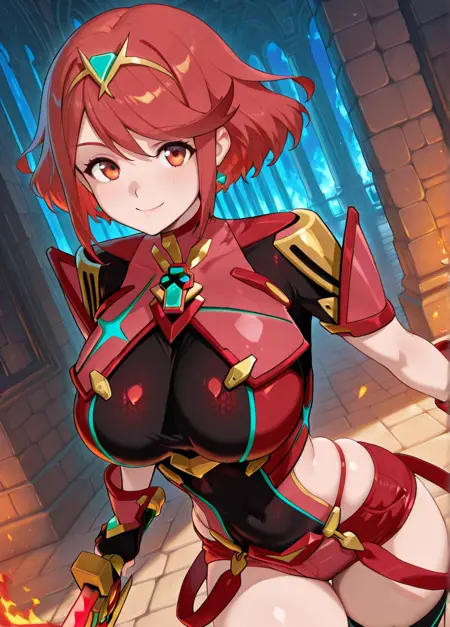 pyraxd, 1girl, 빨간 머리, 가슴 보석, 빨간 눈, 단발, 관모, 앞머리, 쓸어올린 앞머리, 귀걸이, 보석, 밥컷
