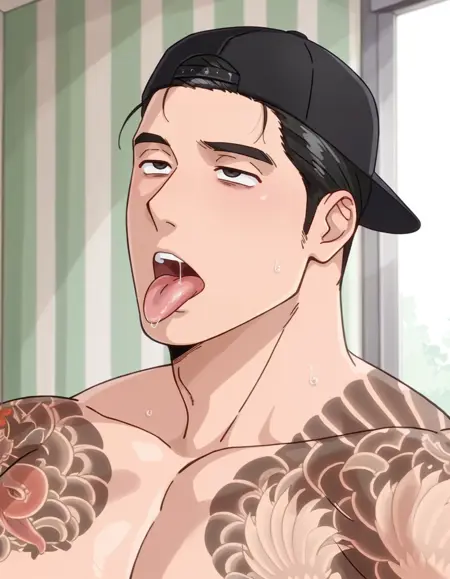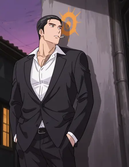 kyoujiil, black eyes, black hair, neatly combed, slicked back, tattoos