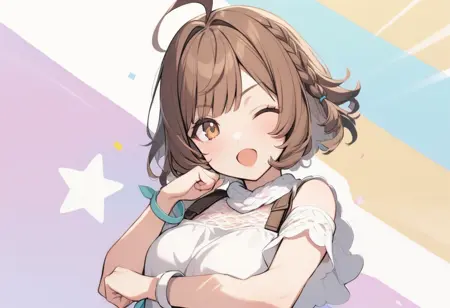one eye closed, solo, bangs, looking at viewer, upper body, open mouth, hand on chin