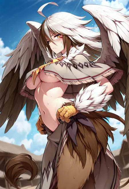griffonmge, monster girl, animal hands, animal legs, feathered wings, multicolored wings, white wings, brown wings, large wings, brown tail, neck tuft, mane, black claws, arm fur, leg fur, digitigrade, fewer digits, scaled hands