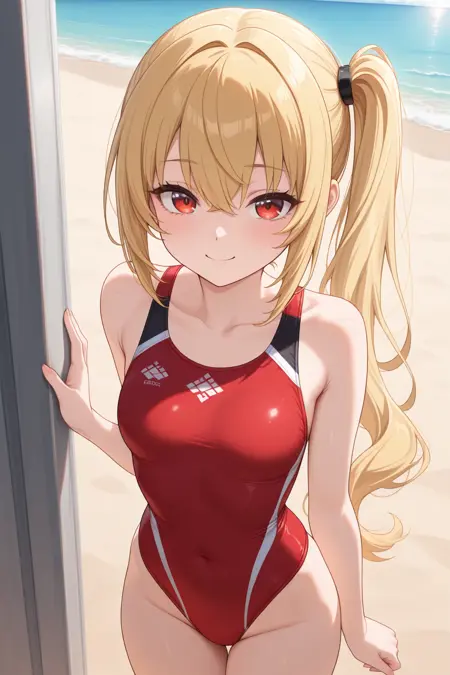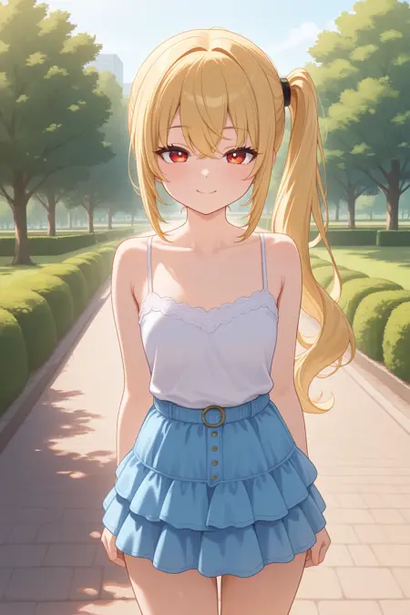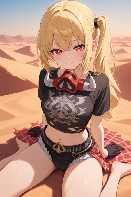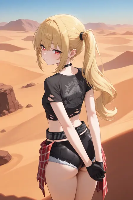 aalucy, red eyes, blonde hair, side ponytail, lucydef, black shirt, crop top, torn shirt, black gloves, midriff, black shorts, denim shorts, micro shorts, plaid bandana,