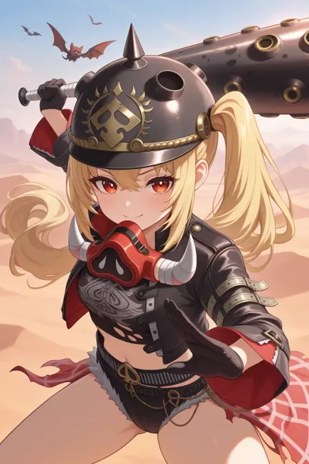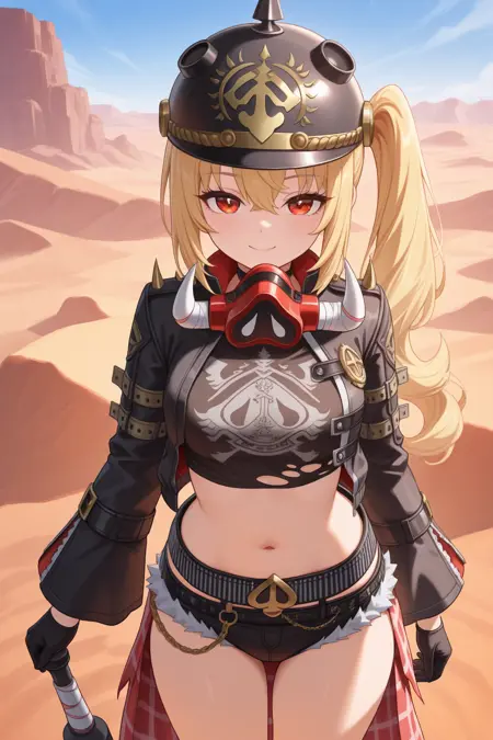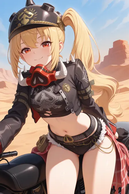 aalucy, red eyes, blonde hair, side ponytail, lucydef, helmet, gas mask, mask around neck, black shirt, crop top, torn shirt, black jacket, leather jacket, cropped jacket, shoulder spikes, black gloves, midriff, black shorts, denim shorts, micro shorts, plaid bandana,