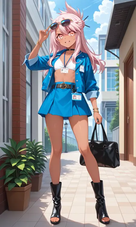 Chloe von Einzbern (Fate/kaleid liner Prisma Illya), long hair, hair between eyes, yellow eyes, pink hair, dark skin, dark-skinned female, hair ornament, half updo, breasts, small breasts, thighs, sunglasses, ring, belt, jacket, blue jacket, blue skirt, id card, choker, jewelry, bag, boots, high heels, toeless footwear