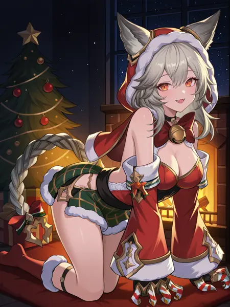 gbf_s3ncat, xmas_s3n, animal ears, grey hair, long hair, hair between eyes, orange eyes, red hoodie, hood up, ears through headwear, red capelet, red bowtie, neck bell, jingle bell, sideless outfit, lace_trim, red stole, black waist sash, cleavage, red detached sleeves, wide sleeves, claw (weapon), striped claws, green skirt, plaid skirt, fur-trimmed skirt, microskirt, hip vent, grey tail, braided tail, tail ornament, fur-trimmed socks, red socks