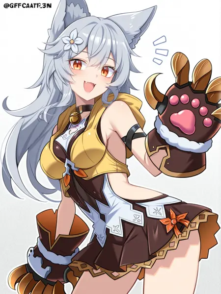 gbf_s3ncat, og_s3n, animal ears, grey hair, long hair, hair between eyes, orange eyes, belt collar, red collar, yellow hood, brown boobplate, sideless outfit, sleeveless, yellow tabard, center opening, black arm straps, claw (weapon), brown belt, black microskirt, hip vent, braided tail, brown tail, tail ornament, knee boots