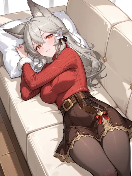 gbf_s3ncat, val_s3n, animal ears, grey hair, long hair, hair between eyes, orange eyes, single hair flower, hair ornament, red sweater, turtleneck sweater, ribbed sweater, long sleeves, fur-trimmed sleeves, pom_pom_(clothes), brown belt, high-waist skirt, layered skirt, brown skirt, pantyhose