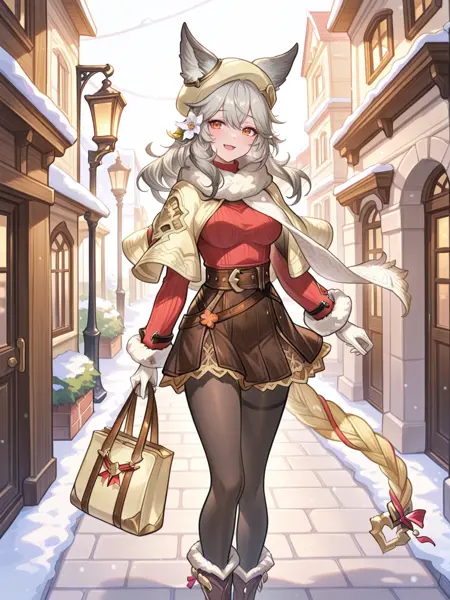 gbf_s3ncat, val_s3n, animal ears, grey hair, long hair, hair between eyes, orange eyes, single hair flower, hair ornament, yellow beret, ears through headwear, yellow capelet, fur-trimmed scarf, long scarf, red sweater, turtleneck sweater, ribbed sweater, long sleeves, fur-trimmed sleeves, pom_pom_(clothes), white gloves, brown belt, high-waist skirt, layered skirt, brown skirt, pantyhose, yellow tail, braided tail, tail ornament, tail ribbon, fur-trimmed boots, brown boots, holding bag