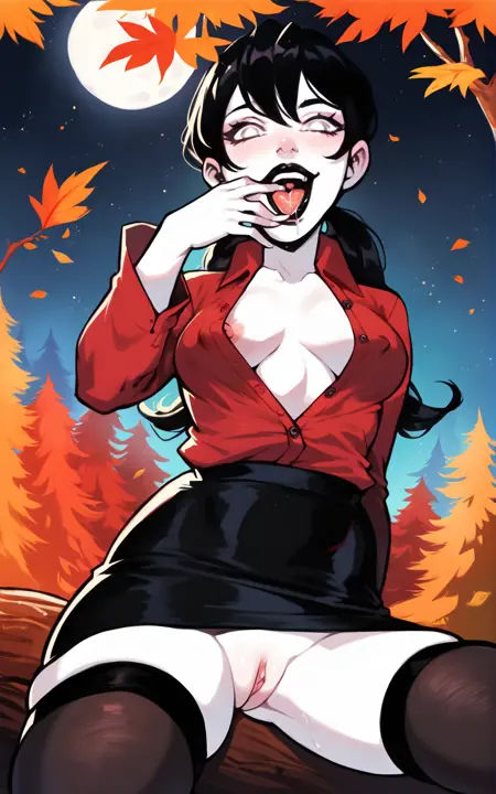 衣装:黒い靴下、パンツィスト、スカート、黒いスカート、ロングスカート、赤いシャツ、長袖、ボタンシャツ**