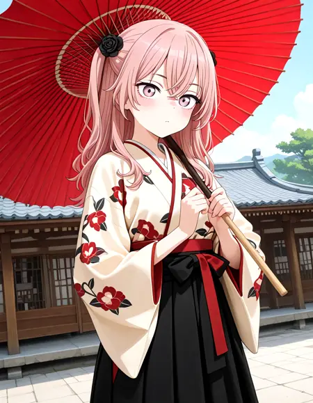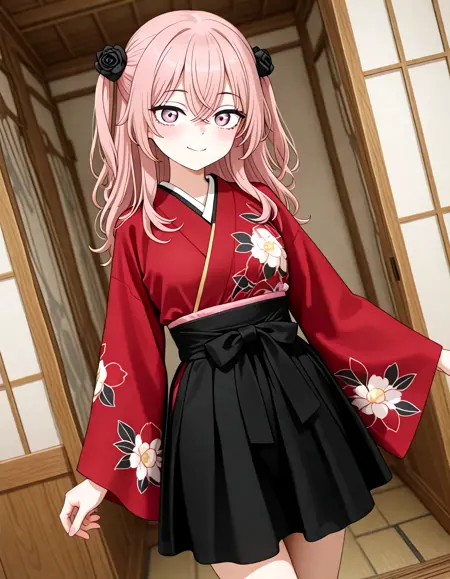 Lady_Lazy_Hakama_Style_Dress, japanese clothes, hakama, hakama skirt, long sleeves, floral print, wide sleeves