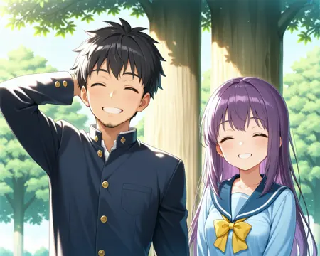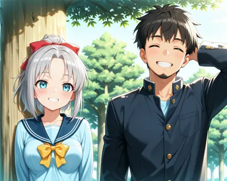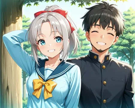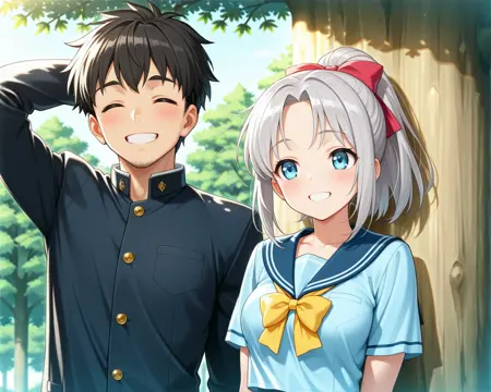 Lora01: 오른쪽 배경에 전설의 나무(큰 나무)가 있는 상태에서, 왼쪽 화면에 있는 손을 뒷머리에 대고 부끄러워하는 소년과 소녀