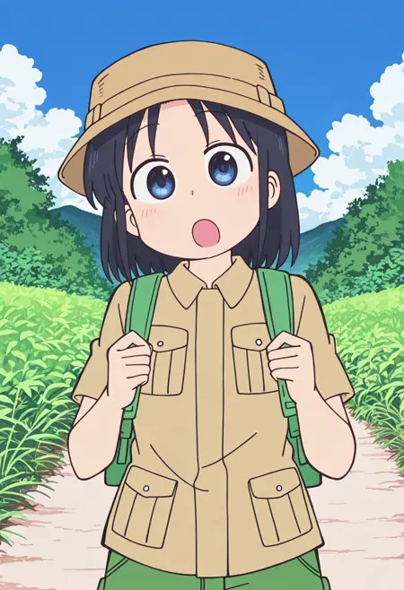 衣装3:薄茶色のサファリシャツ、薄茶色のサファリ・バケツハット、折りたたんだ袖、緑のバックパック、緑のショートパンツ、赤いブーツ、ストラップ付き双眼鏡