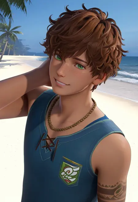renato_lyra, olive green eyes, freckles, medium skin tone, colorful granny square crochet pants in yellow purple green red pattern, blue tank top with lace-up front, beaded necklaces, arm tattoos, sandals,