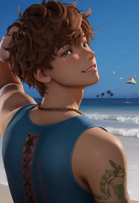 renato_lyra, 올리브 그린 눈, 주근깨, 중간 톤의 피부, 노랑, 보라, 초록, 빨강 무늬의 화려한 그랜마 스퀘어 뜨개질 바지, 앞면 끈 매듭 형태의 파란 탱크탑, 비즈 목걸이, 팔 문신, 샌들