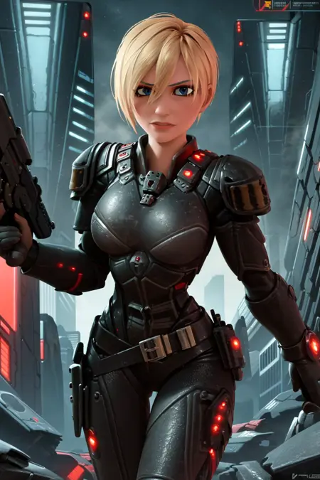 Other prompt : armor, blonde hair, blue eyes, bodysuit