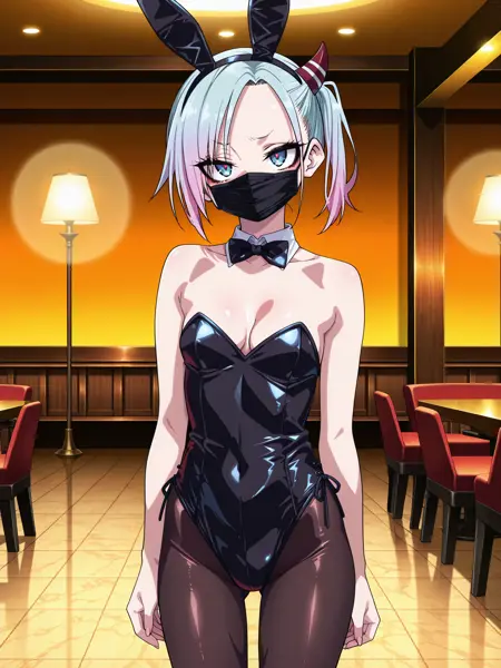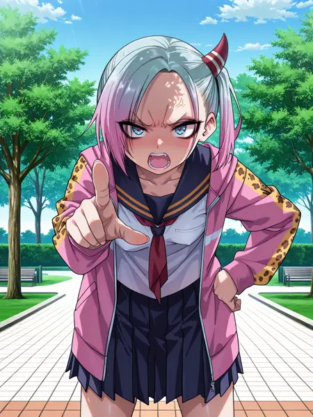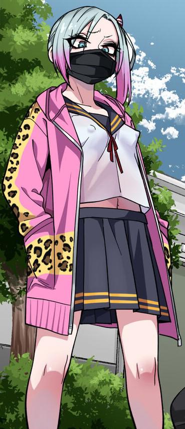 — 彼女は大胆なツートンヘアと角のようなアクセサリー、そして「触るな」と叫ぶような反抗的な姿勢で目立つ。スカート、フーディ、マスクというレイヤードなルックは、心を守ることを選び、感情を表に出したがらない、ツンデレな不良青年の雰囲気を醸し出している。クラシックな不良のエネルギーを放つ一方で、鋭い歯と赤らんだ頬は、意外なほど繊細で弱い側面をほのめかす。タoughとtenderの完璧な融合で、見逃すことも、忘れることもできない存在だ。