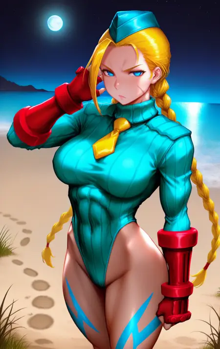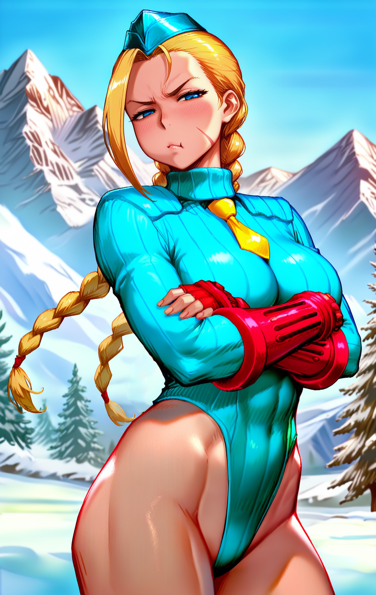 | 训练词汇 | c4mmysf4lp, blue eyes, blonde hair, antenna hair, low twin braids, very long hair, scar on cheek, garrison cap, blue headwear, blue leotard, yellow necktie, short necktie, turtleneck leotard, highleg leotard, thong leotard, ribbed leotard, long sleeves, covered navel, abs, groin, red gloves, bracer, fingerless gloves, toned female, bandages, thick thighs, camouflage, bodypaint,已复制! |