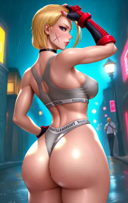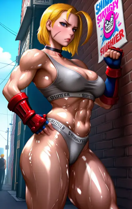 | 训练词汇 | c4mmysfck, blue eyes, blonde hair, antenna hair, short hair, scar on cheek, black choker, pendant choker, grey sports bra, underwear, midriff, navel, abs, toned female, red gloves, black gloves, uneven gloves, fingerless gloves, single vambrace, grey panties, clothes writing, thick thighs,已复制! |
