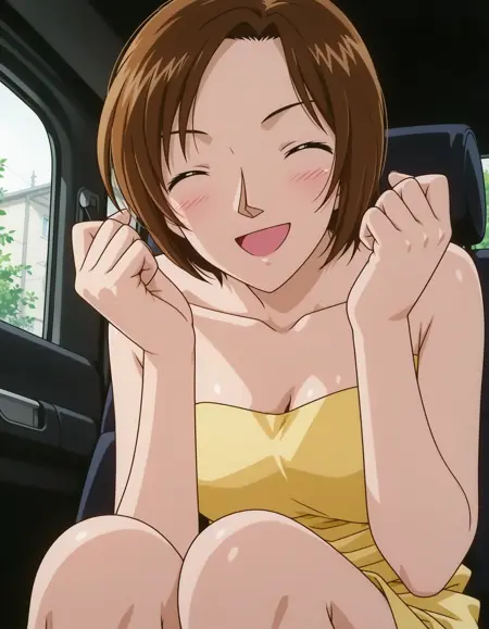 ayeh,black hair,brown hair, straight hair, very short hair,forehead,collarbone,cleavage,yellow shirt,sleeveless,off shoulder,strapless,yellow skirt,brown shoulder bag,