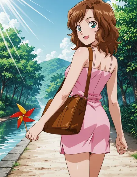 bpiw,brown hair,medium hair,wavy hair,swept bangs,forehead,bare shoulders,sleeveless,pink dress,brown shoulder bag,