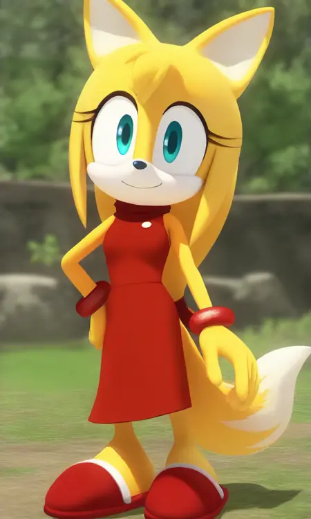 1girl, solo, 3d, Zooey_the_fox, anthro, red dress, red bracelets, red shoes, yellow tail with white tip
