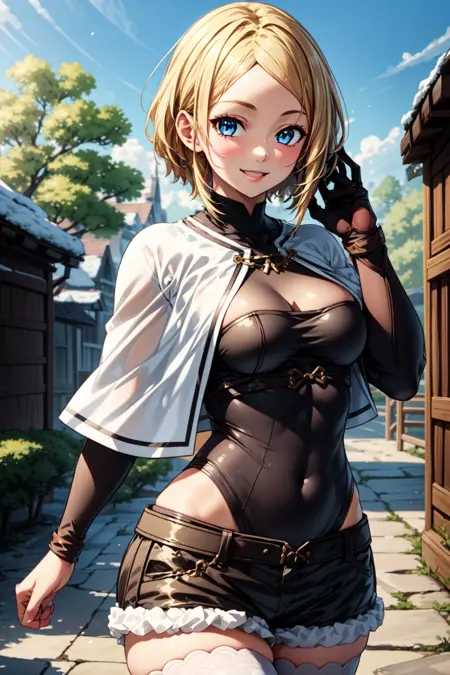 SaraMushokuNDV, 1girl, blonde hair, blue eyes, medium breasts, shory hair, white thighhighs, brown gloves, brown shorts, black leotard, capelet