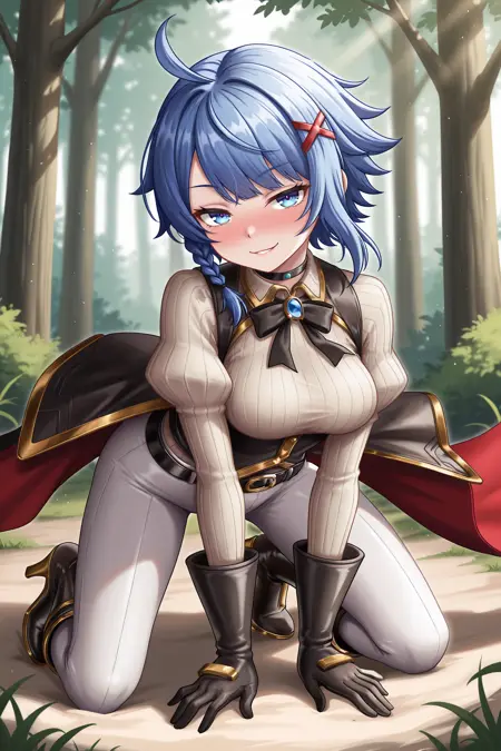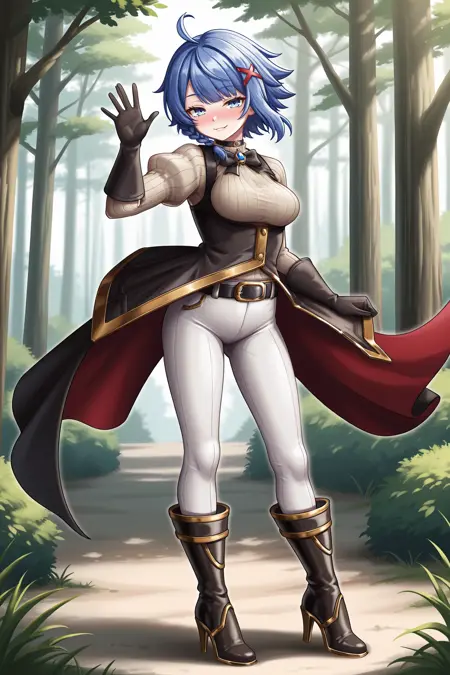 ➜ ChloeGSILXL, 青い目, 青い髪, 短髪, 前髪, アホ毛, 片方の編み髪, 赤い髪飾り, ブラックのチョーカー, チョーカーの青い宝石, 中くらいの胸, 黒い蝶ネクタイ, 袖のない黒いジャケット, 縦縞のセーター, パフスリーブ, 黒い手袋, 黒いベルト, 白いズボン, 黒いブーツ, ハイヒール