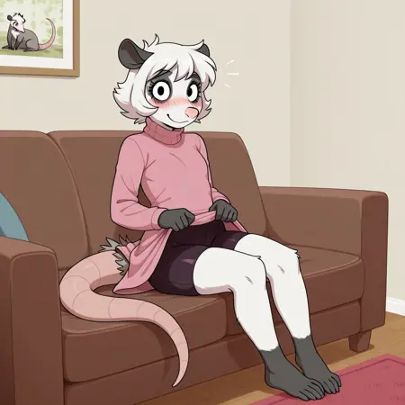 Possum, American opossum, white fur, white hair, short hair, black eyes, Possum ears, pink nose, black arms, black legs, Possum tail, blue bandana, pink turtleneck dress, blue jacket,
