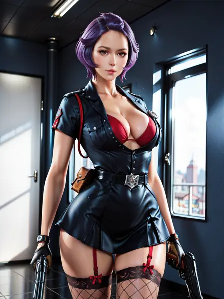 FOX HAWL\(CROSSFIRE\),FOX HAWL\(military uniform\),purple hair,short hair,wavy bob cut,forehead,brown eyes,short military-style dress,deep neckline,red bra visible,gloves,garter belts with red bows,fishnet thighhighs,black leather boots,gun,
