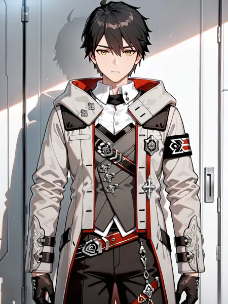 1个男孩,亚当(APHO),黑发,黄眼睛,白衬衫,背心,灰色外套,腰带,黑色手套,黑色裤子,黑色靴子,