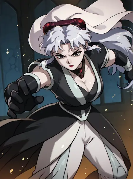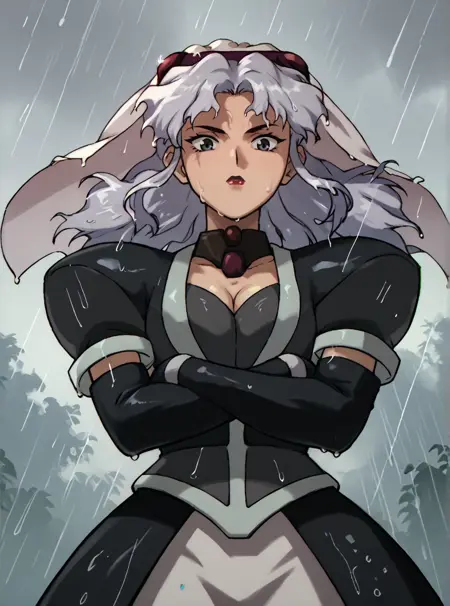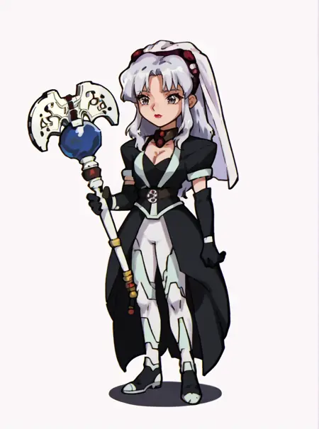 IfuritaOva, 1girl, dark gray eyes, long silver hair, i7t3 tiara with veil, if5rut4 clothes, lipstick,