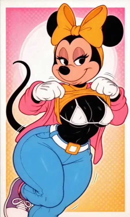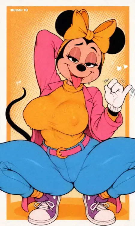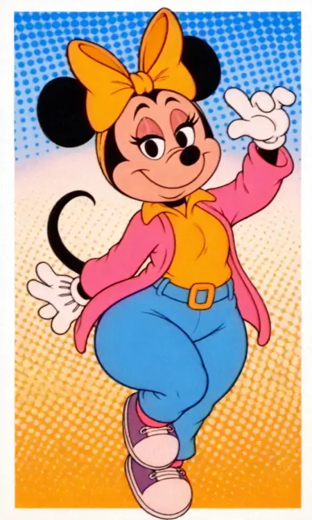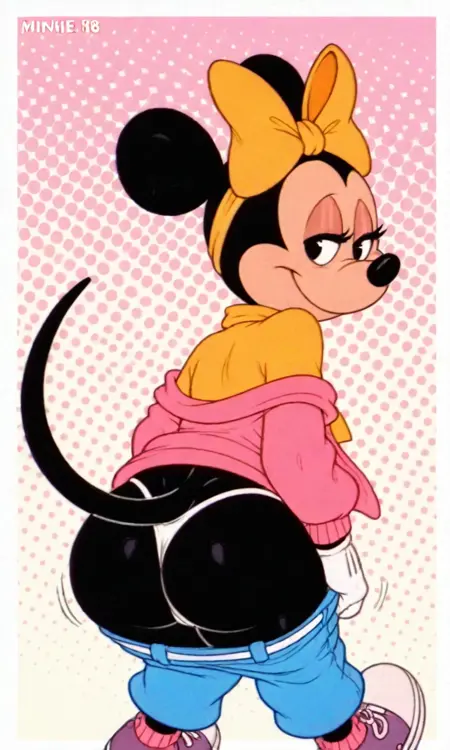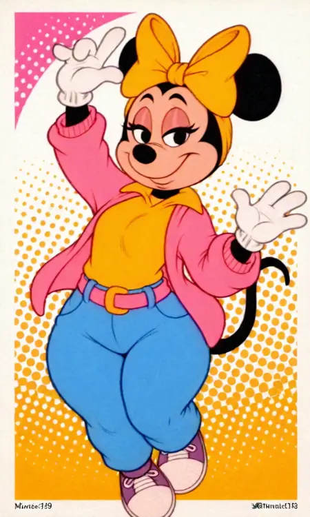 タグ: minnie_1988, 黒い目, 黒い耳, マウスタイル, 白い手袋, 黄色い髪のリボン, 黄色いシャツ, ピンクのセーター, 青いズボン, ベルト, 紫白の靴