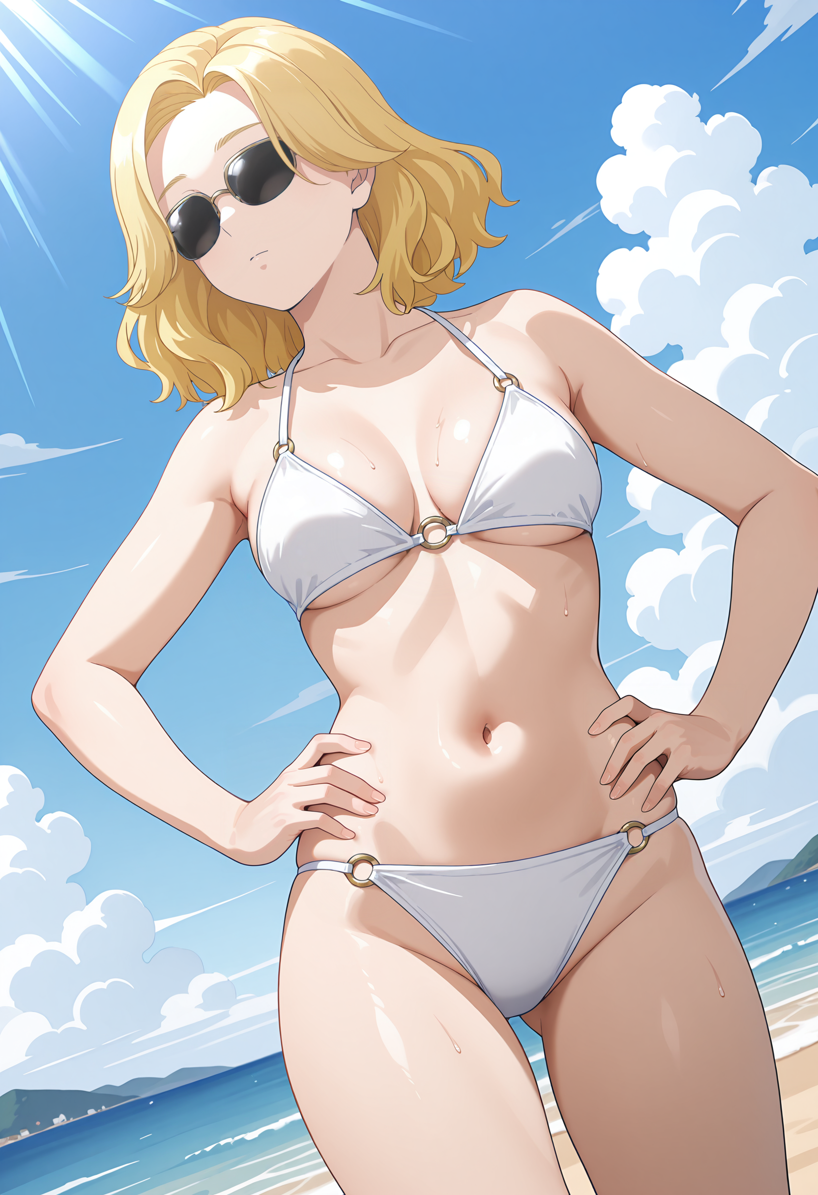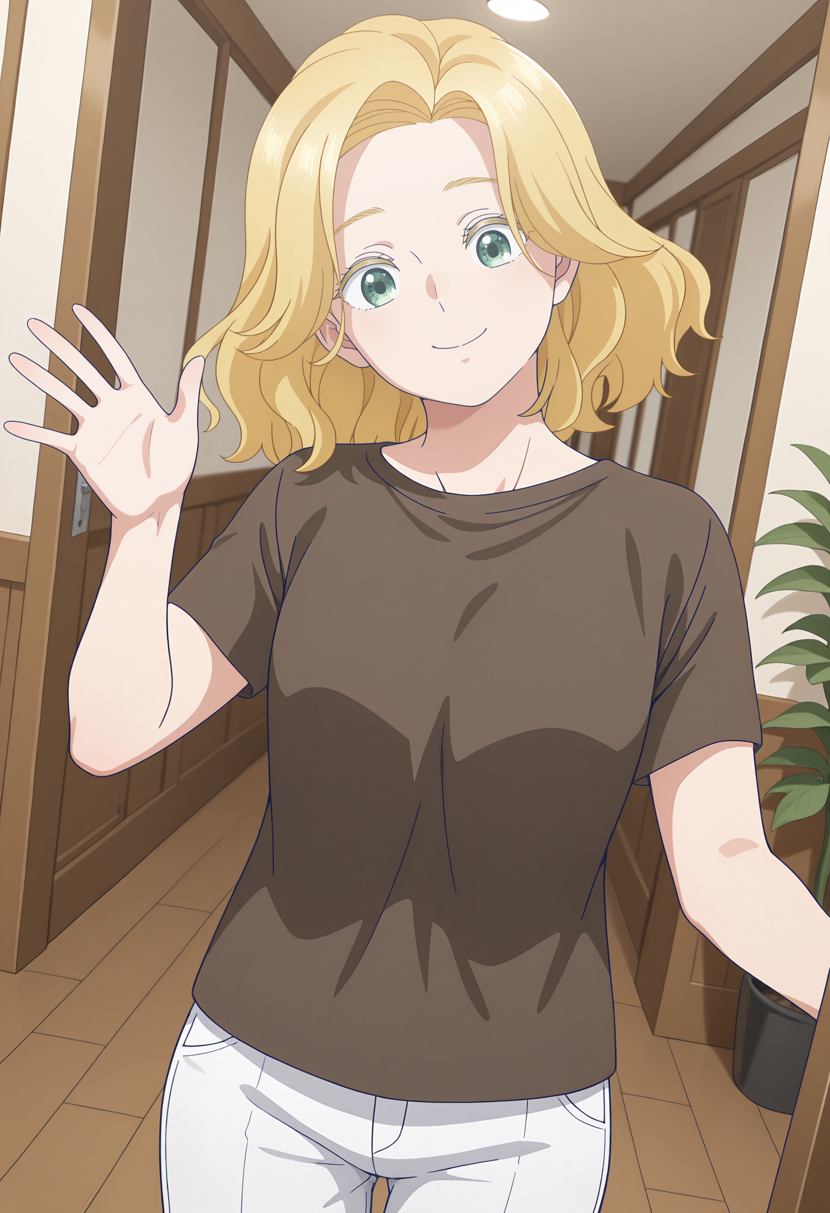 AmekimiEmma, green eyes, blonde hair, medium hair, curtained hair, wavy hair — You can add "mature female" if you want to accentuate those features