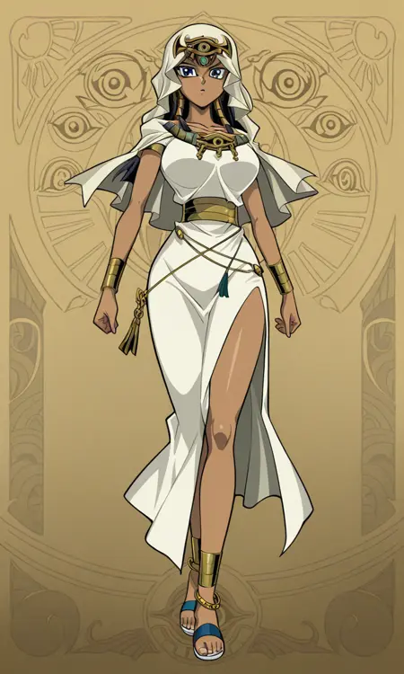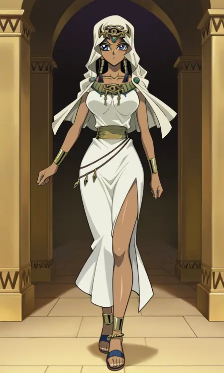 ishuzu ishtar,1girl,solo, blue eyes, dark skin, dark-skinned female, black hair, egyptian,veil, eye of horus, bracelet, anklet, sandals, dress,large breasts,