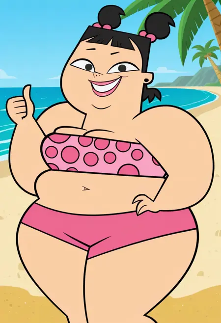 比基尼:sadie(总戏剧),丰满,黑眼睛,黑发,短双马尾,发球,黑耳环,粉比基尼,波点胸衣,无肩带胸衣,肚脐(如需可添加“粉胸衣”和/或“粉内裤”)