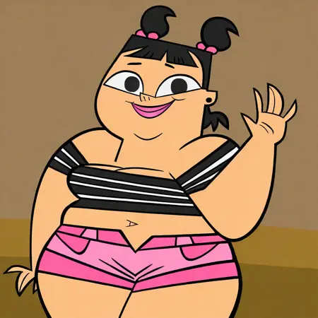 默认外观:sadie(总戏剧),丰满,黑眼睛,黑发,短双马尾,发球,黑耳环,条纹衬衫,露肩衬衫,露腹,肚脐,粉短裤,超短裤,粉鞋,套鞋,坡跟鞋