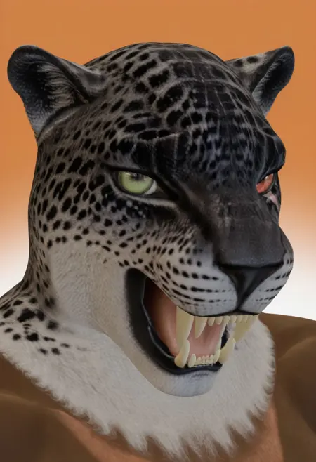 armor_king, muscular dark-skinned male, jaguar head mask, fangs, heterochromia, red eyes green eyes, scar across eye