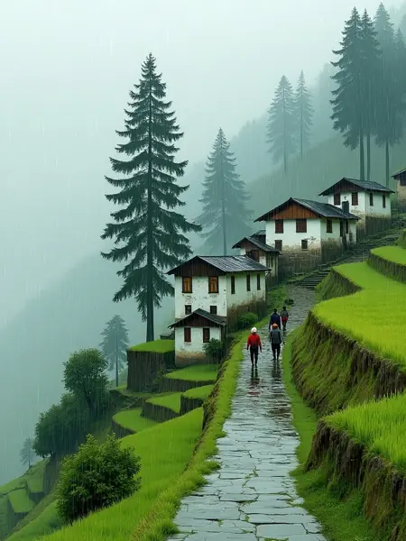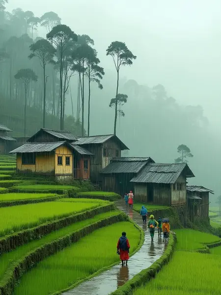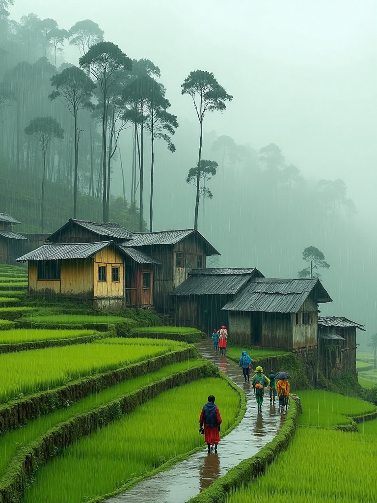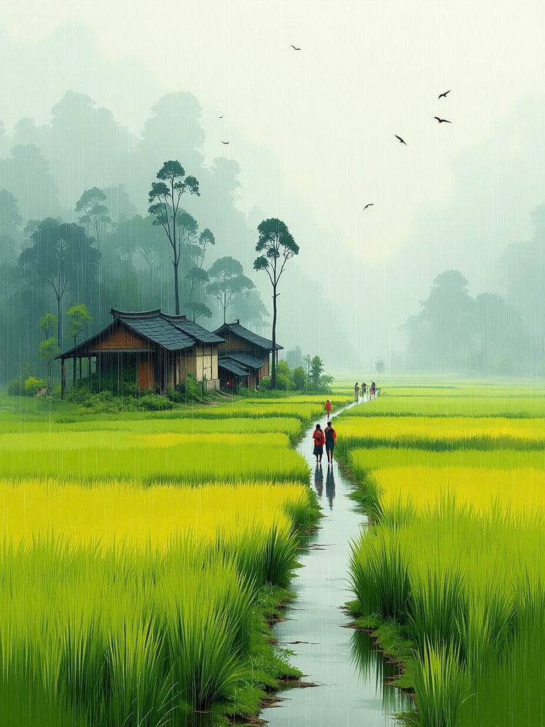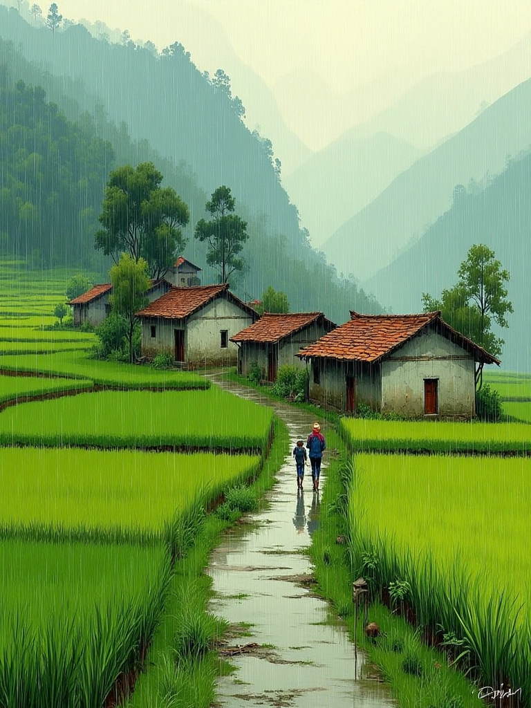 緑豊かな田畑と家々のある田園風景、柔らかい雨で霧がたなびき、道が曲がりくねり、人物が散策中、オイル絵画の質感、静かな雰囲気。