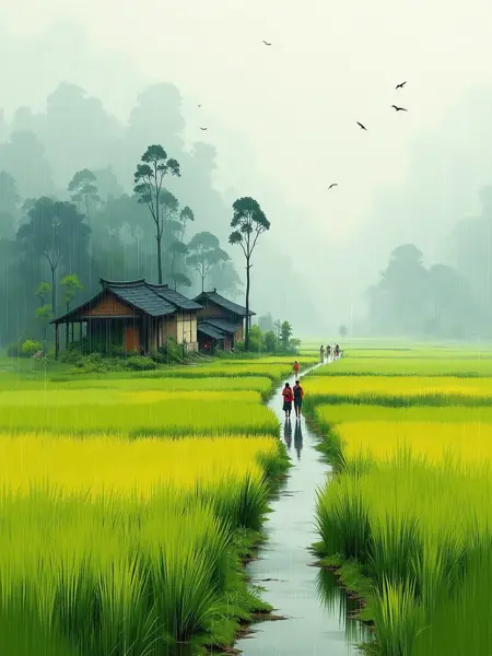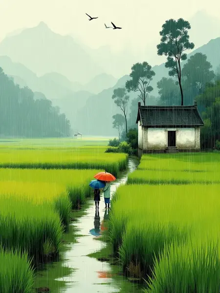 緑豊かな田畑と家々のある田園風景、そよ風が作物を揺らし、遠くの山々は霞み、素朴な村民が歩いている、墨絵スタイル。