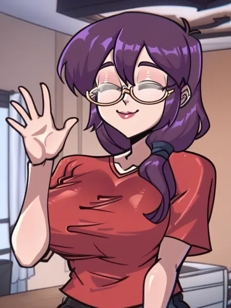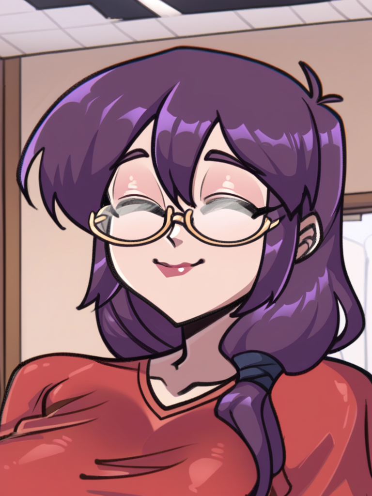 juno_mgr, purple hair, glasses, closed eyes, long hair, semi-rimless eyewear,