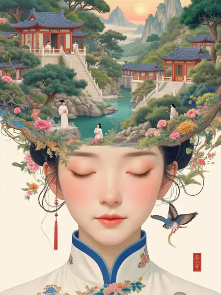 2. 将中国传统元素与超现实肖像融合,用水墨山水、梅花和玉佩装饰肖像。