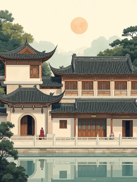 Traditional Chinese architectural style, riverside dwellings, willow trees, boats on water, morning fog, delicate woodwork, pastel tones.